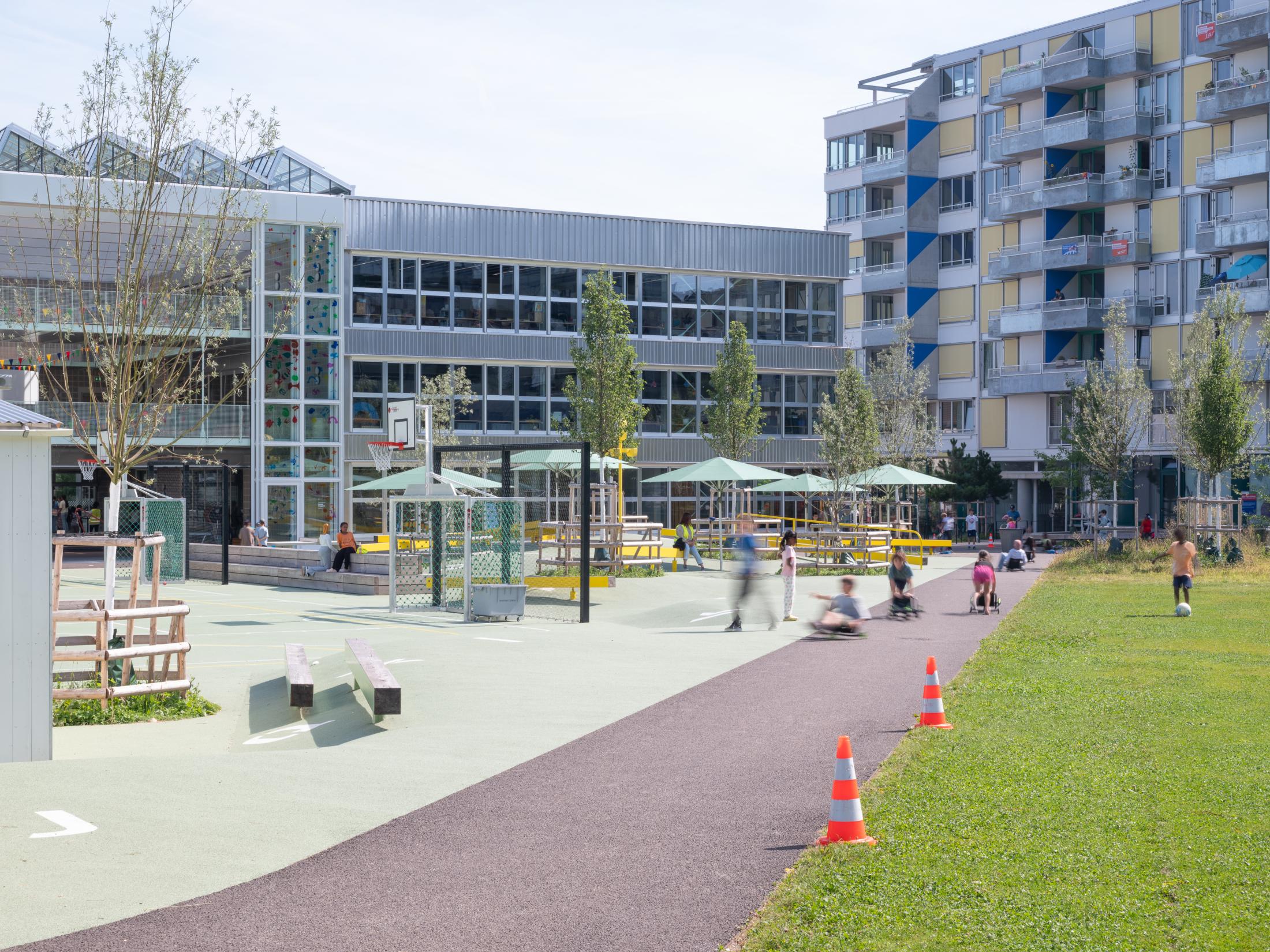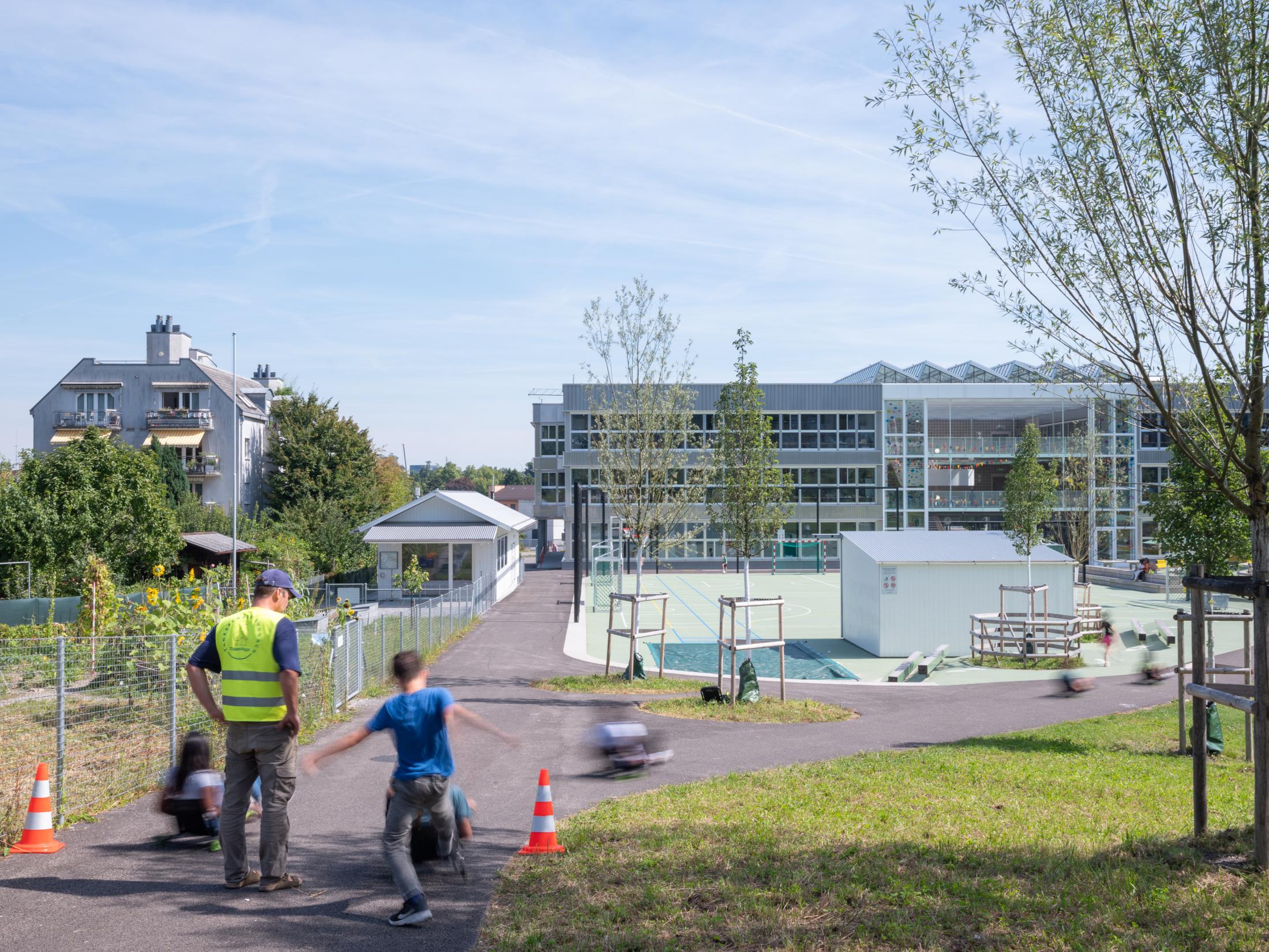The Guggach school campus and neighborhood park in Zurich present themselves as a precisely composed ensemble of architecture and landscape. The centerpiece of the showcase building is the foyer – an unheated transitional climate zone that opens via sliding gates to the adjacent schoolyard and neighborhood park. The park functions as a connecting link between the surrounding urban district and the nearby recreational area on Käferberg. The park highlights the topography and offers a wide range of uses, including a grass playing field, community gardens, and areas designed to reflect a natural environment. Large wooden furnishings provide striking visual accents and create spaces for social interaction.